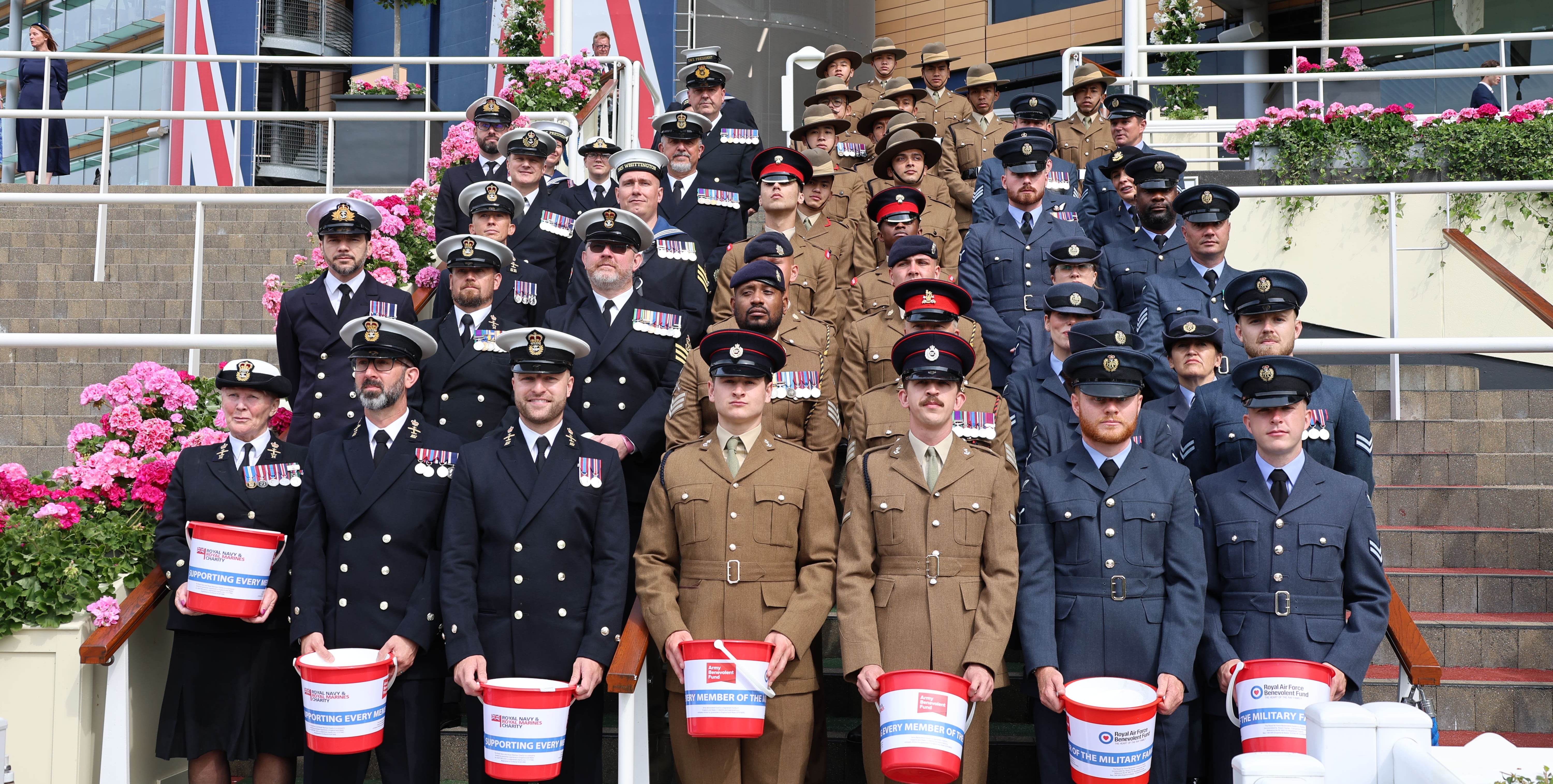 This June, the Army Benevolent Fund joined the Royal Navy and Royal Marines Charity (RNRMC) and the RAF Benevolent Fund (RAFBF) for a special tri-service fundraising effort at the prestigious Royal Ascot. Serving personnel from the Royal Navy, Royal Marines, British Army, and Royal Air Force supported the appeal, collecting donations from racegoers at the close of each day.