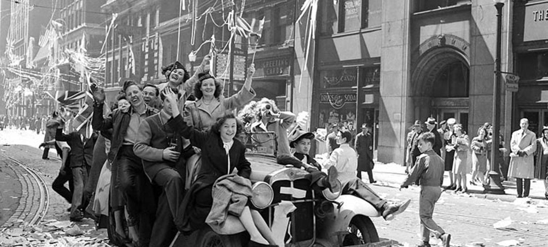 “The first thing we did was to get into Piccadilly and we joined a crocodile that was doing the hokey-cokey or the pally glide down Piccadilly. Everyone was just singing, cheering. I remember masses of American soldiers climbing up lampposts. It was chaos, really, but joyous chaos.”